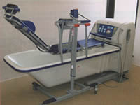 座位の取れる方は椅子に腰掛けた状態のまま機械で浴槽に降ろします。 この場合、ある程度体を動かす力がある利用者さんも椅子に固定されて、ご自分の意思に関係なく機械で動かされることになります。