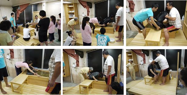 ゴールデンウィーク中に工事を行うことになりました。ゴールデンウィークはデイサービスがお休みなので、工事中は特養の利用者さんはデイサービスのお風呂を借りて入浴します。利用者さんに迷惑をかけるわけにはいきませんので、工事中の入浴場所の確保は重要な課題でした。デイサービスには昨年一足先につくった檜の個浴浴槽があります。工事期間中にデイサービスの個浴を使用することで、特養での個浴移行の準備が出来るというメリットもありました。特養の主任が、個浴初体験の職員にも丁寧に指導をし、安心して個浴を開始することが出来ました。