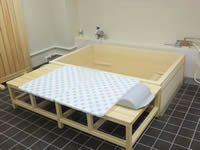 平成元年の設立以来使用してきた浴槽はこんな感じでした。ご自分で歩ける方は浴槽内の階段を降りて湯船に入ります。