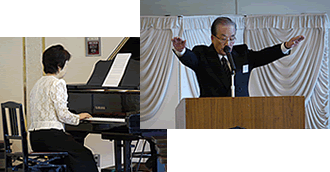 第1部は山本牧師の司式による厳かな式典、第2部は和やかな雰囲気の小宴で、ピアノ連弾と昔からのスナップをスライド上映しました。