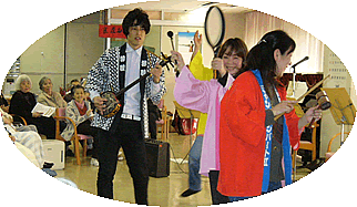 グループホームの職員が沖縄の三線(さんしん)で、沖縄民謡『安里谷ユンタ』を演奏。